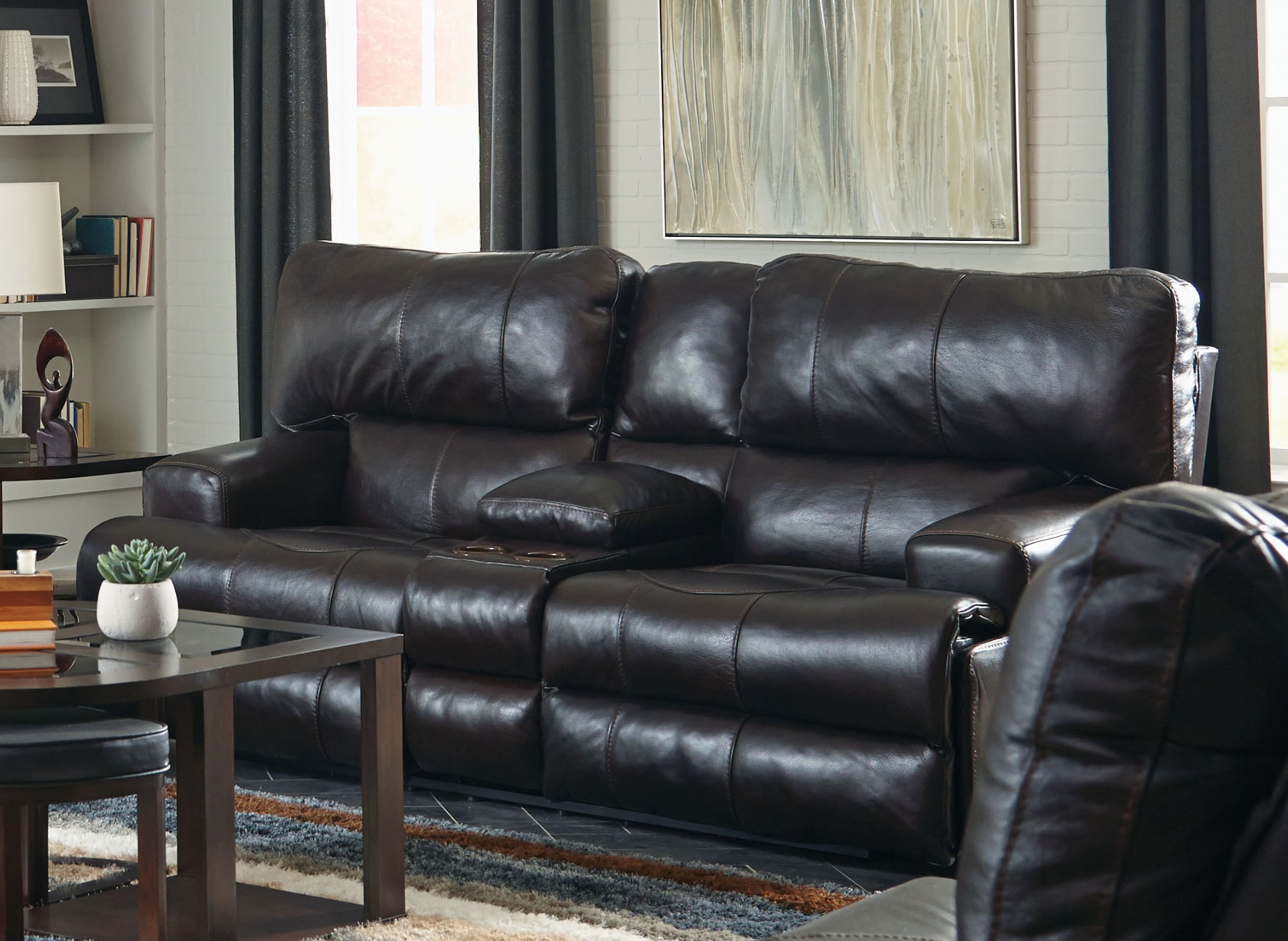 Plush, spacious, and multi-functional—the DNA of the Wembley lay flat reclining console loveseat by Catnapper®. The loveseat is upholstered in top-grain Italian leather accented by durable and decorative luggage stitching. Get comfy as you lounge with a good book or loved one. The loveseat features a center console with 2 convenient cupholders as well as a lift-top storage for remotes or magazines; close the console for a cushy armrest. Bring the Wembley loveseat into your home to add a flair of style and comfort.