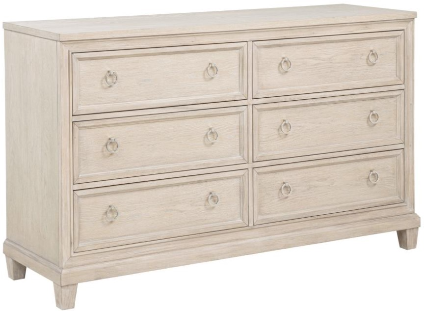 Softly structured and beautifully balanced, this six-drawer dresser brings timeless charm to the bedroom. Framed with clean lines and stepped trim, it offers generous storage behind a refined facade. The washed oak finish reveals natural wood grain, while polished nickel ring pulls add a hint of shimmer.Read More