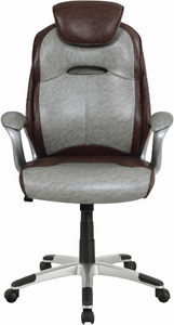 Lovely shades of brown and light gray elegantly combine to give this office chair an attractive look. Fashionable and functional, it offers exquisite comfort and versatility. Its ergonomic armrests and headrest allow you to relax comfortably as you work or study. Its swivel base and convenient casters offer perfect positioning and easy movement. Complete with a cozy, padded seat and smooth, leather-like upholstery, this chair promotes hours of productivity.