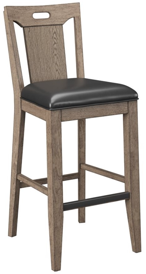 Belly up to the bar of your choice with the Benton. Options abound for the perfect spot to gather with friends and family with this casual, bar height dining collection. Randomly matched oak veneers finished in a warm, pecan brown create a laid-back appeal while hardwood solids, easy-to-maintain PU faux leather upholstery, and metal foot rails and kick plates assure the Benton collection will stand up to the rigors of everyday use.