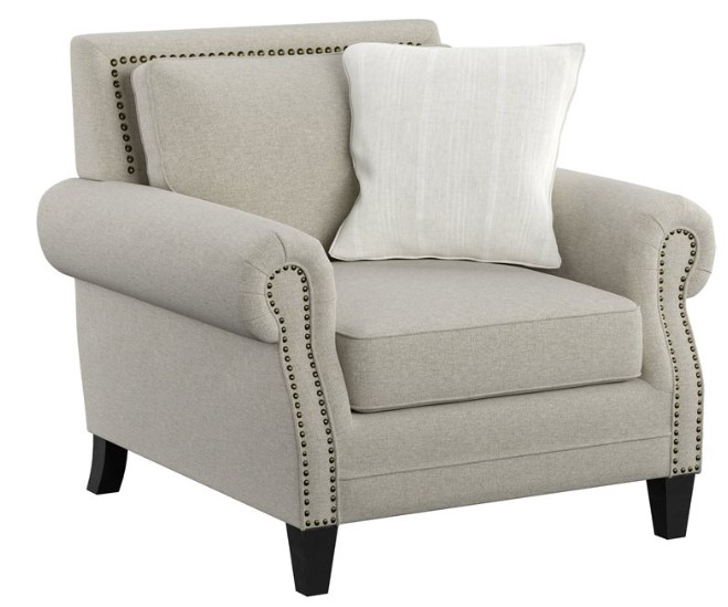 The Celia collection livens up a traditional setting with a pop of color. The contrast of bronze nailhead trim against Saxon beige fabric highlights the elegant shapes of rolled arms and tapered solid wood legs.Read More