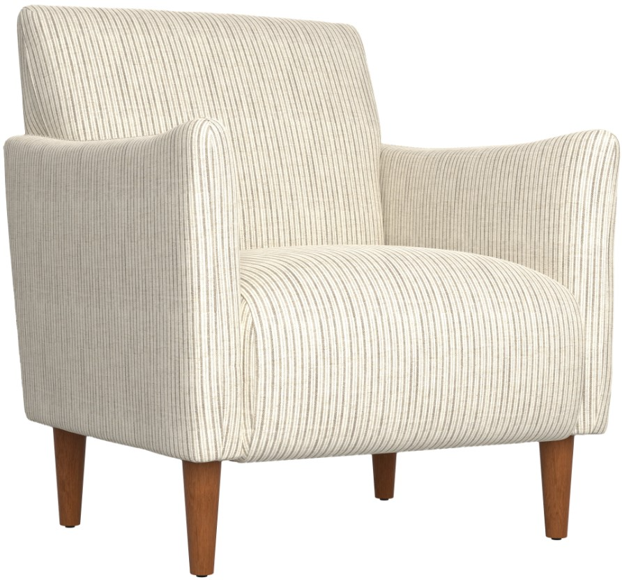 Cozy up to the soft tones of the Letty accent chair. Warm beige striped with brown and taupe blankets the low profile with a smoothly upholstered back and curved arms. Tall solid wood legs lighten the silhouette as they taper to the floor.Read More