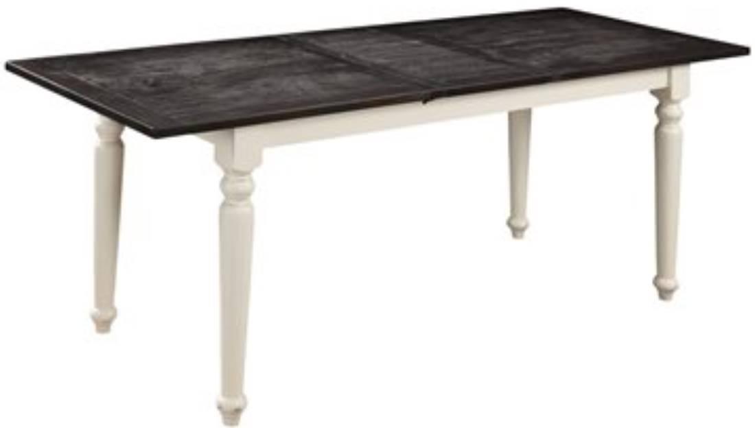 Two-tone finish: dark mocha planked top and antique white turned legs.