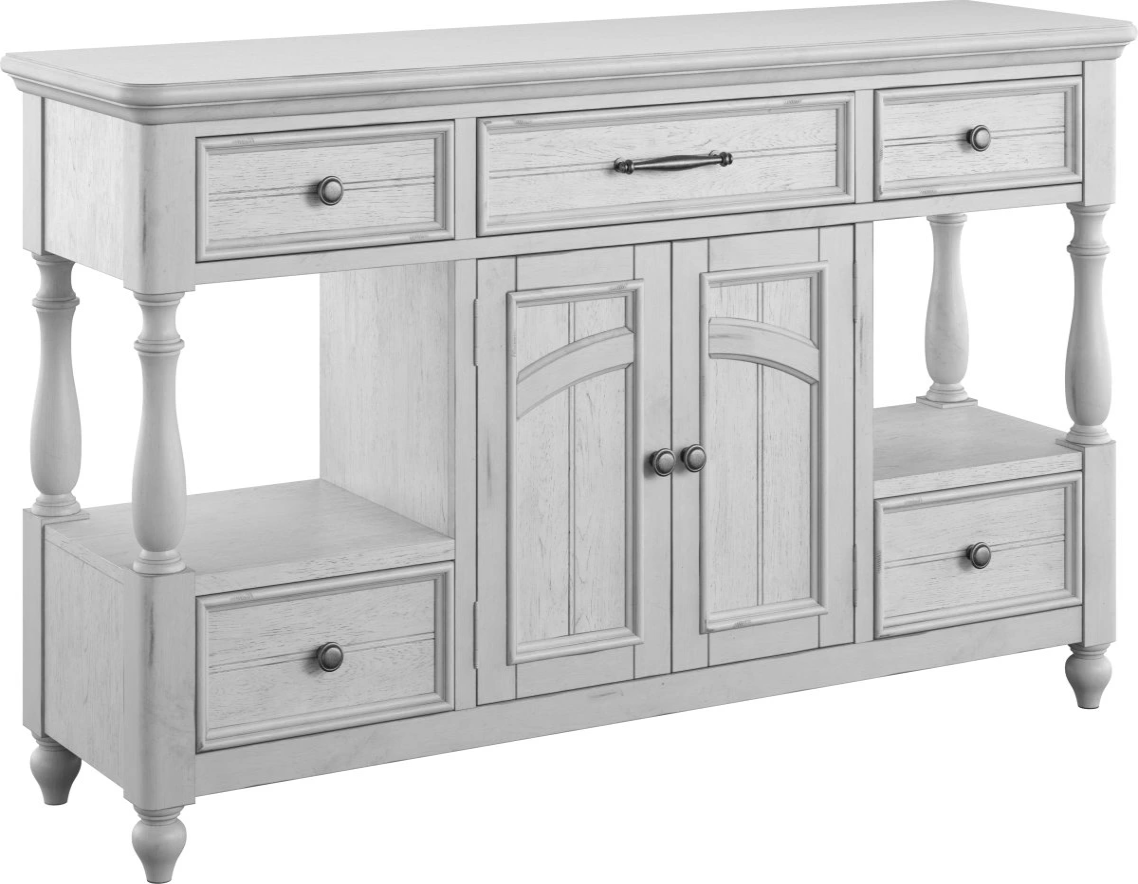 Grand in scale but casual in feel, the New Haven dining collection is an easy winner decorated with classic arches, scored fronts, and turned wood details. The oyster shell finish with light distressing lends a weathered appearance that pairs with charming antique pewter pulls and knobs for a seaside look.Read More