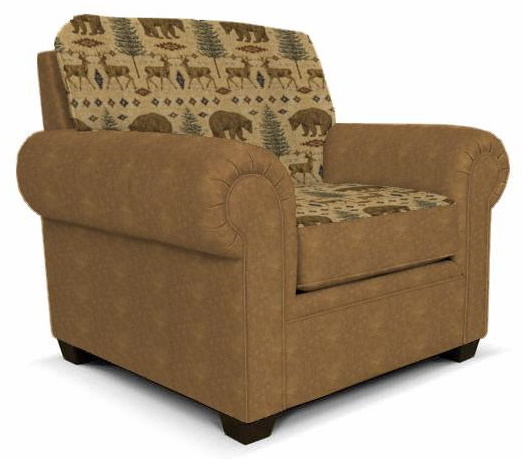 The lodge look is alive and well in our Jaden group. A three cushion style in married fabrics with pyramid legs and rolled and welted arms. Toss pillows are reversible. Novelty patterns combined with a leather-look-alike provide the perfect choice for your cabin or retreat home. Loveseat, chair, ottoman, and queen sleeper also available.Read More