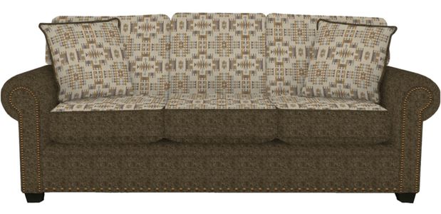 The lodge look is alive and well in our Jaden sofa. A three cushion style in married fabrics with pyramid legs and rolled and welted arms. Toss pillows are reversible. Novelty patterns combined with a leather-look-alike provide the perfect choice for your cabin or retreat home. Loveseat, chair and ottoman also available.Read More