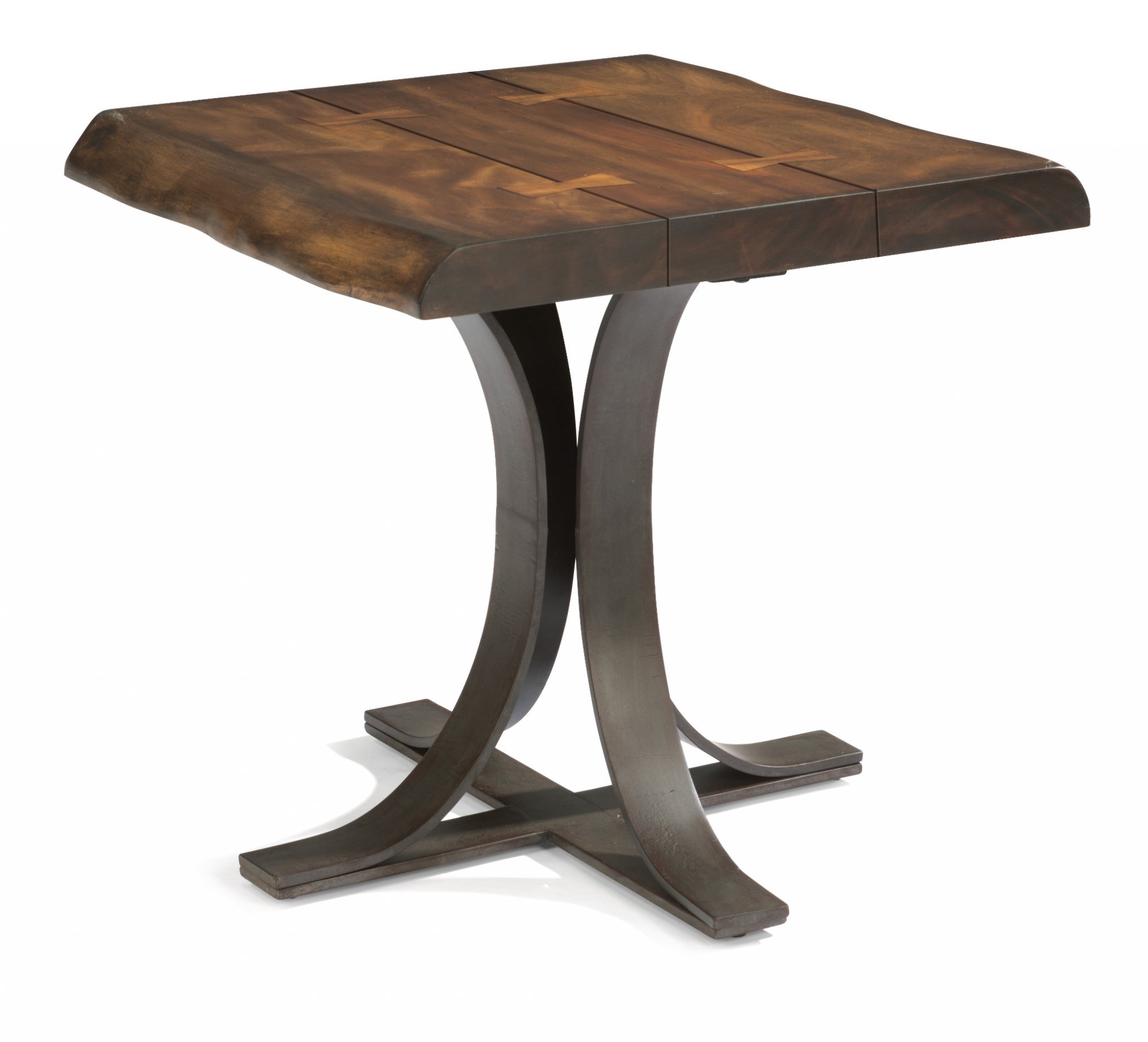 Farrier's signature butterfly key joinery and thick, wavy edges make it a bold statement in any room. Solid log-cut acacia tops feature a deep walnut wood finish, and the contrasting bases are constructed of contoured hand-forged flat iron in a raw steel finish. This lamp table fits nicely next to your favorite chair or recliner.