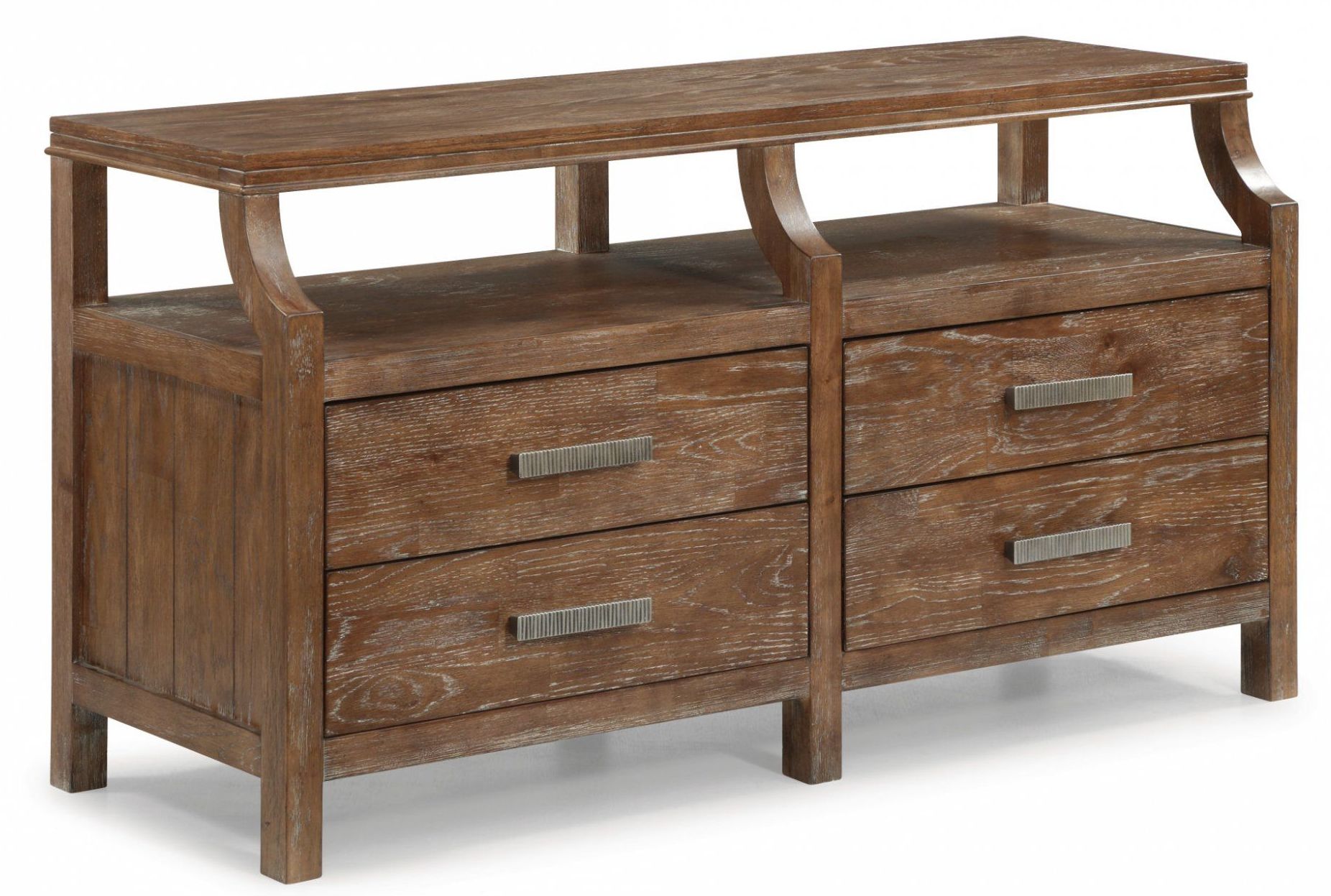This entertainment base from the Hampton collection features 4 drawers and conspicuous shelving for consoles and channel boxes.