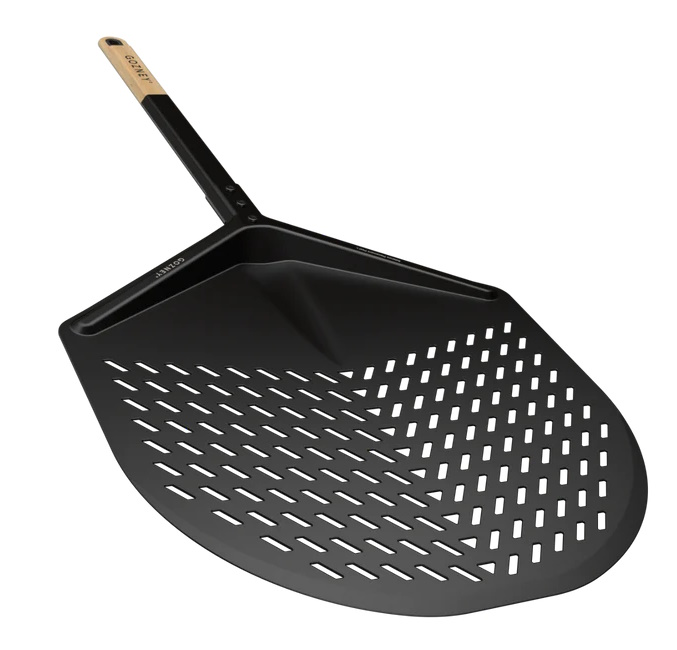 Combining the lightweight aluminum blade with a comfortable Beech wood handle, this durable placement peel enables you to launch pizzas with greater ease and control. The blade is designed with a flat nose to increase stability and reduce rocking from side to side while sliding on or launching pizzas into the oven, so your pizza keeps its shape during transfer. The perforated metal lets excess flour fall through for delicious crust without the unwanted burnt taste. Designed to be ergonomic, the wood handle shifts the center of gravity closer to the hand for more control. The soft touch of the wooden handle is timeless and classic in its feel.