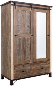 Features large mirror on door, open to reveal hanging rod
