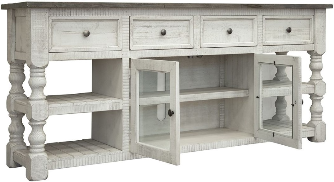 Two tone, multi-step lacquer finish. Tops feature weathered gray finish on hand-distressed wood. Eggshell antiqued finish on the rest of the case pieces.