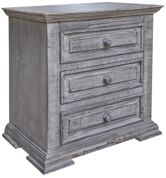 Finish is achieved through a multi-step lacquer in a gray distressed tone