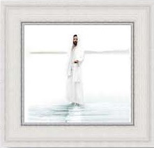 Blue water with white background and mountain silhouette. The Savior in white reaching out and beckoning to come unto Him.