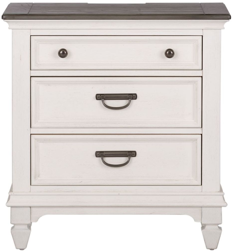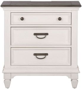 Bring beauty indoors with the Allyson Park king panel bed, dresser, mirror, and nightstand. Crafted of pine solids and veneers with cathedral white oak tops, this kit features a wire brushed white finish with planked charcoal tops, bead molding, full extension drawers with felt lined top drawers.Read More