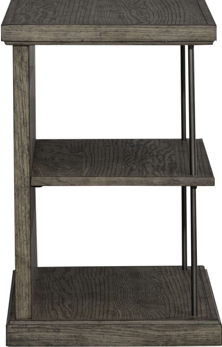 The chairside table features shelving suspended by metal tubing for a floating design. Built to bring a contemporary touch around your seating arrangement, the City Scape chairside table is sure to impress family and friends.