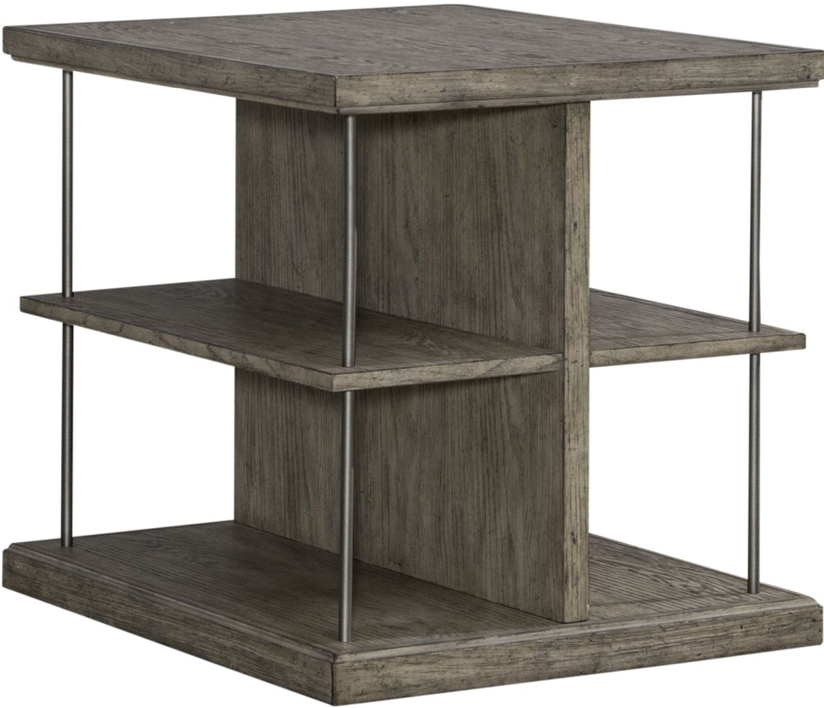 The end table has side shelves suspended by metal tubing for a floating design, offering plenty of storage or room for display items. Built to bring a contemporary touch around your seating arrangement, the City Scape end table is sure to impress your family and friends.