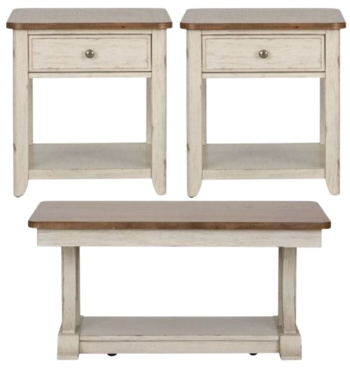 End tables offer chamfered drawer front, one full extension fully stained interior drawer with brass knob hardware, softly rounded pilasters with tapered feet and a bottom shelf for additional storage. Basket is included with end table. Farmhouse style is known for charm and simplicity. Kit consists of one cocktail table and two end tables.