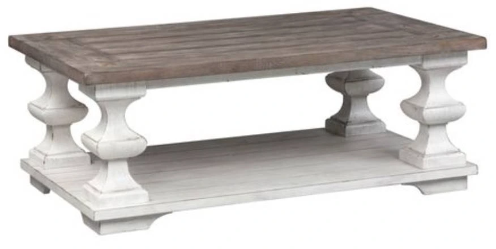 Elevate your space with the Spanish style Sedona cocktail table. Crafted of rubberwood solids and white oak veneers, this piece features a heavy distressed white finish and gravel top, appealing planked top with square peg accents, a planked bottom shelf for additional storage, casters for easy mobility, and is anchored by Spanish style square turned legs.Read More