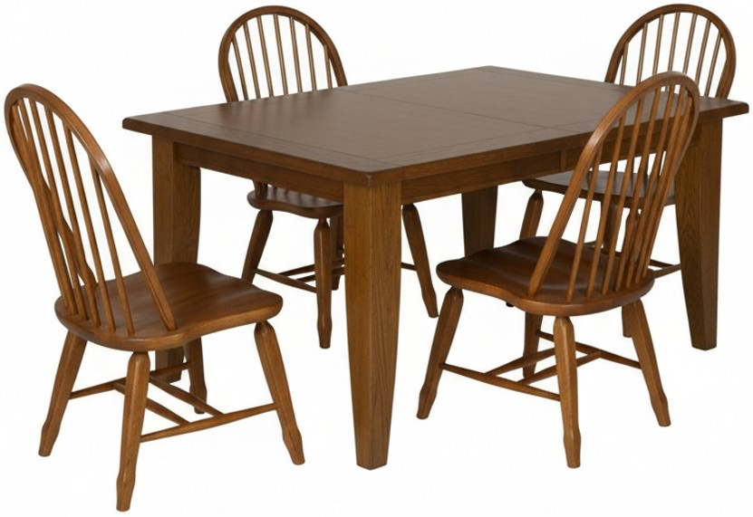 Design possibilities are endless with the Treasures five-piece set. Crafted of rubberwood solids and ash veneers, this set features a rustic oak finish and includes a rectangular leg table and four bow back side chairs. The leg table has a planked top and features two 18” removable leaves to accommodate guests or a larger family.Read More