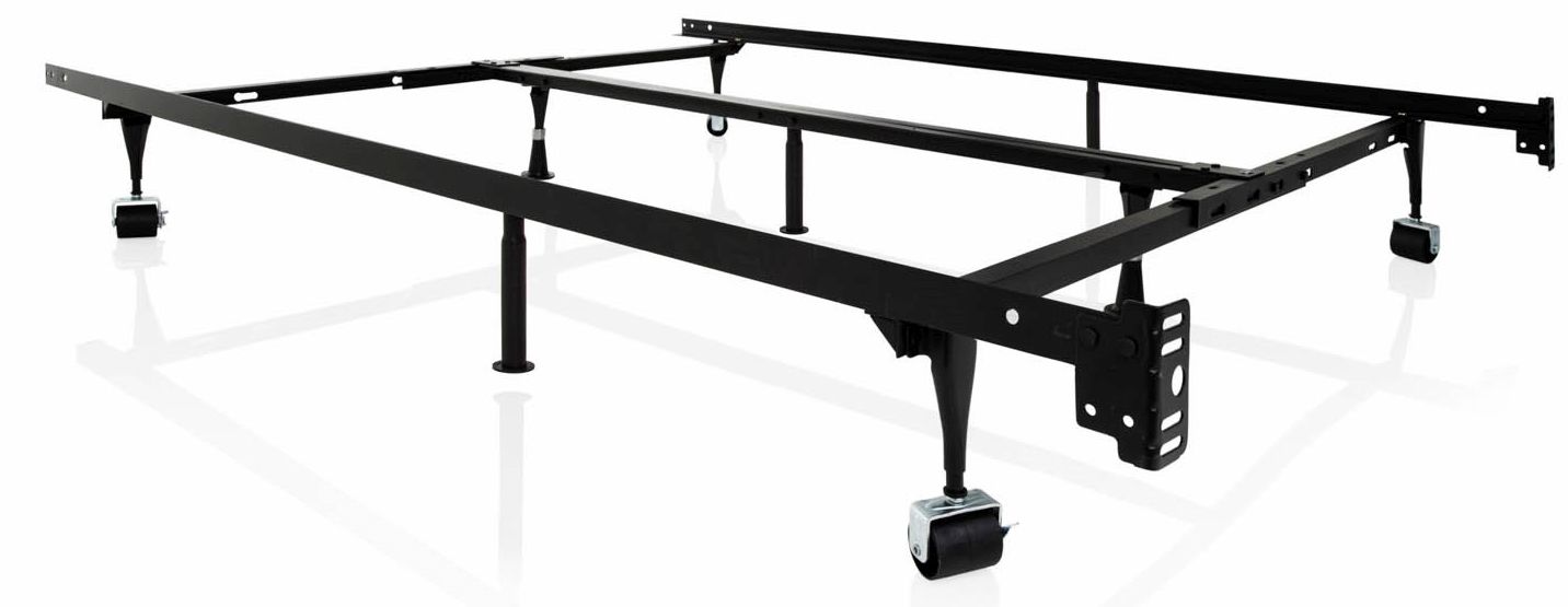 When it's moving time, or time to fit a new mattress, the Universal Bed Frame makes change easy because it quickly adjusts. Long-lasting and highly-adjustable, it allows you to purchase one frame that fits virtually any bed size. Its primary legs are reinforced with the patent-pending Tri-Support™ system creating optimal frame support. The nine leg design includes either 2.5" in-line rug rollers or 3" wide glides that are metal reinforced for exceptional stability; in addition, an extra-wide 2.5" double rail center support is utilized for all sizes. Frame width adjusts between 38 inches and 76 inches with a length of 70 inches.