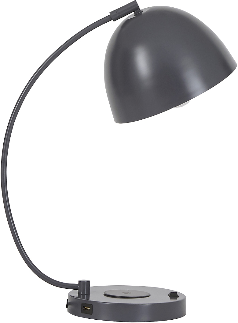 Gray Finished Metal Desk Lamp. Adjustable Metal Shade. Wireless Charger and 1 USB charging port. On/Off Switch. Type G Bulb - 40 Watts Max or 8 Watts Max CFL.