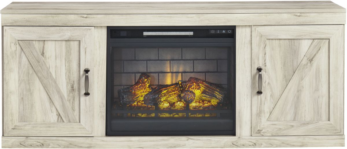 Express your modern farmhouse style with this TV stand with LED fireplace insert. Wispy white finish over replicated oak wood grain is a delightful change from the ordinary. Clean-lined, classic styling with barn door inspiration provides a country chic aesthetic that’s a breath of fresh air. What really turns up the heat: an electric infrared fireplace insert with faux firebrick surround that operates with or without infrared heat and includes a multi flame feature, 7-level temperature setting, five brightness levels and LED glowing embers effect.