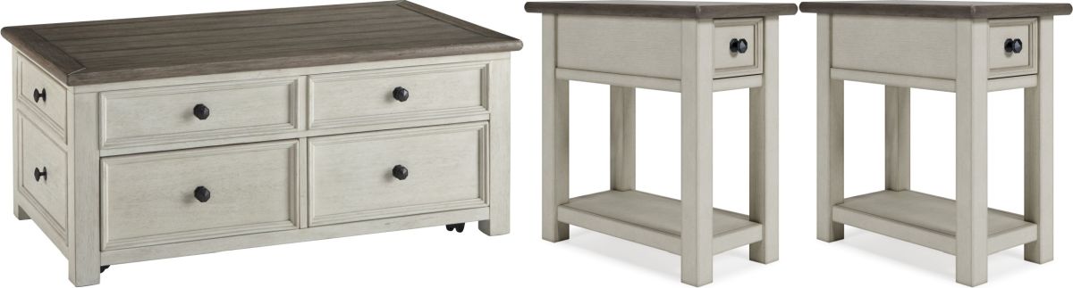 Whether your style is farmhouse fresh, shabby chic or country cottage, you’ll find this occasional table set dressed to impress. Its two-tone finish pairs weathered oak with antique white for that much more quaint character. Charming elements include a plank-and-frame style top, black faceted hardware and smooth-gliding drawers for remote controls and more.Read More