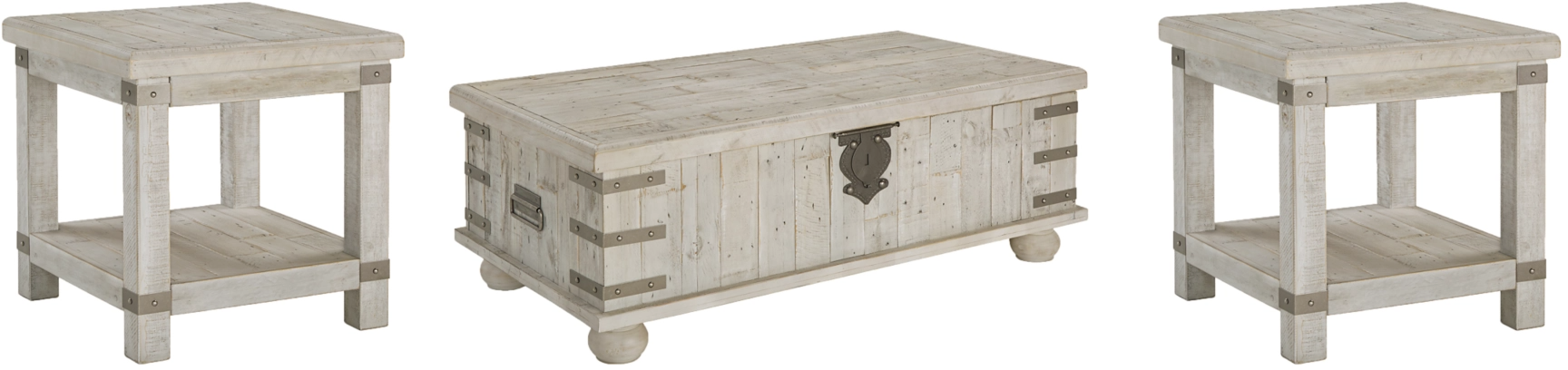 Unlock a quaint touch of farmhouse style and convenience in your living area with this occasional table set. Inspired by the rugged looks of antique furniture, this set charms with a distressed light gray finish that enhances the wood's natural grain. Lift top table makes for an easy work or dining surface. End tables each include a power strip with dual UBS plug ins.