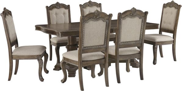 Go ahead and throw the dinner party of the year with the Charmond 7-piece dining table set. Gather around the double pedestal table on the 6 upholstered side chairs and enjoy a feast.