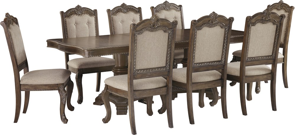 Go ahead and throw the dinner party of the year with the Charmond 9-piece dining table set. Gather around the double pedestal table and sit back against the 8 upholstered chairs and enjoy a feast.