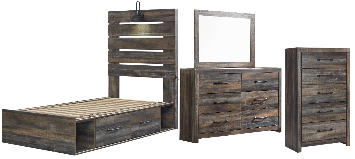 Includes twin-size panel bed (headboard, footboard, platform rails, side storage units and wood roll slats), 6-drawer dresser with mirror and 5-drawer chest