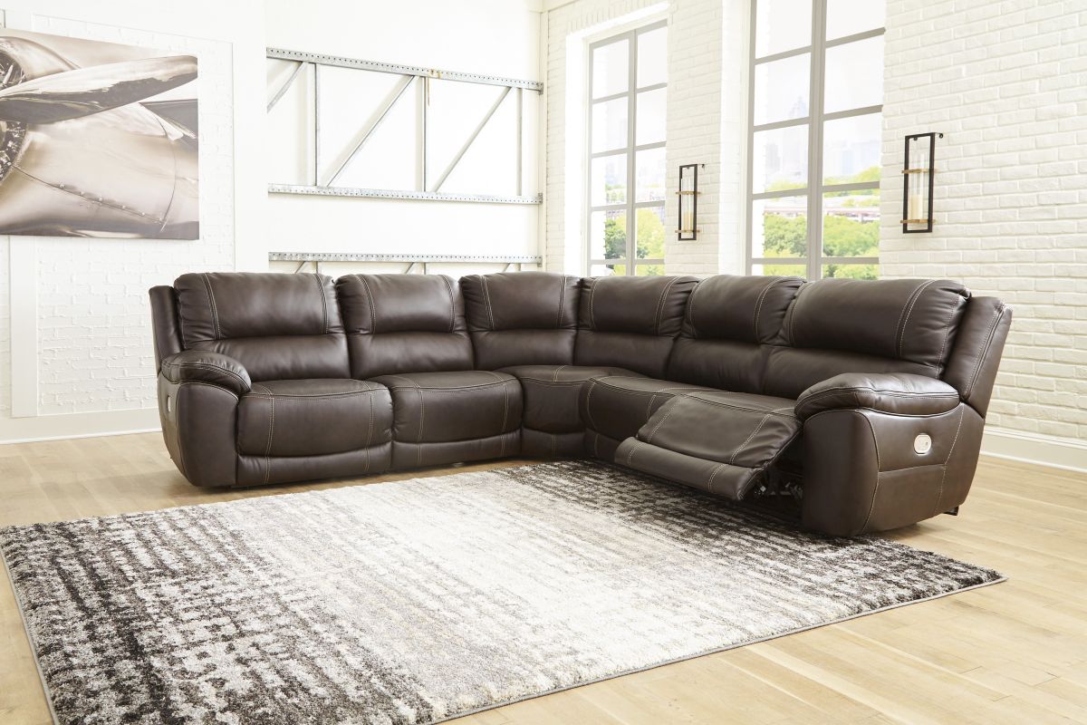 Load up on comfort in a cool, clean-lined, and contemporary way with this power reclining sectional in chocolate brown. Rest assured, the expertly matched leather and faux leather upholstery is enriched with a pebble grain effect for authentic appeal and enhanced with jumbo stitching for dramatic contrast.Read More