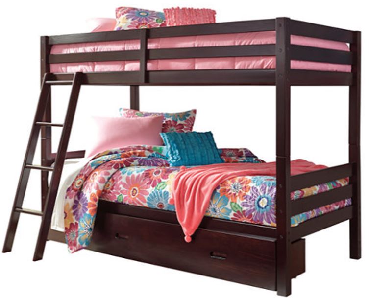 Save space while making bedtime a lot more appealing with the Halanton twin bunk bed with storage. Sporting a clean-lined contemporary design, Halanton is kid-friendly furniture with a touch of grown-up sophistication. This solidly made bed has protective guard rails with a fixed ladder for easy top bunk access. Set on casters, the under bed drawer is ideal for storing toys, clothes and linens. Mattresses sold separately.