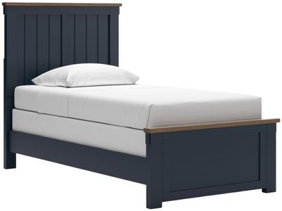 Add homespun charm to your restful retreat. A modern take on a timeless silhouette, this twin panel bed pairs a dark slate blue finish with light brown accents. The slatted headboard in a classic shaker style brings an air of beautiful simplicity to the bedroom.Read More