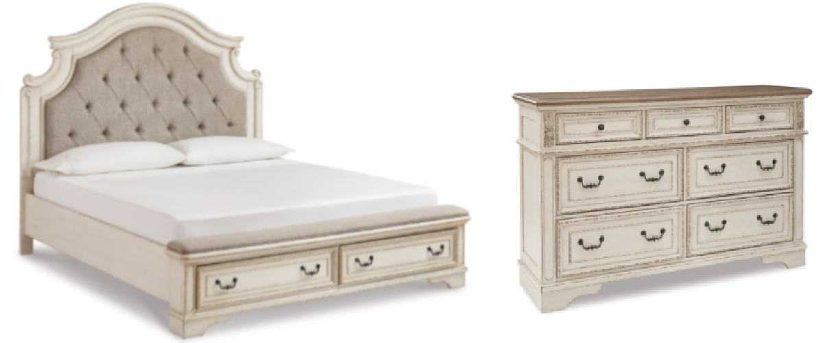 Elevating the art of traditional cottage styling, the Realyn dresser is your dream bedroom retreat realized. Antiqued two-tone finish blends a heavily distressed chipped white with a natural wood tone top for added charm. Assembly required for this product.