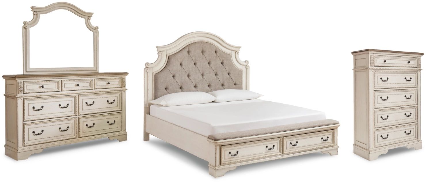 Includes California king upholstered bed (headboard, footboard and rails with roll slats), 7-drawer dresser with mirror and 5-drawer chest