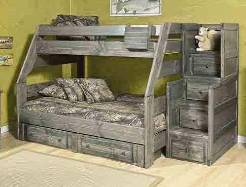 Have fun and save space with the Bayview High Sierra collection. Made with solid wood construction and rustic gray lacquered finish shows off the natural beauty of wood and ensures that this bunk bed will stand the test of time. Twin over full with 2 drawer under dresser for storage needed. Optional wood ladder or stairway chest for opposite ends of the structure to access the top bunk.